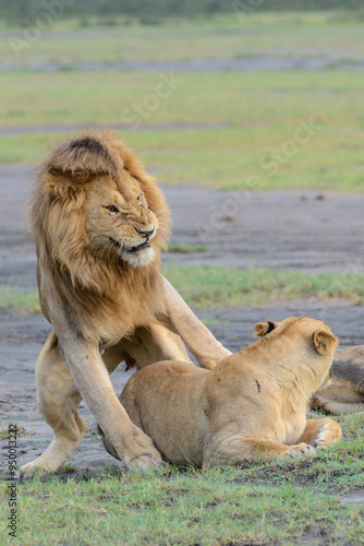 © Russell, Fototapeta premium Male and female lions (Panthera leo) during their prolonged mating process