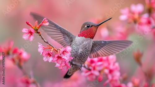 © Tuong, Naklejka premium Male Anna's Hummingbird Approaching Colorful Flowers
