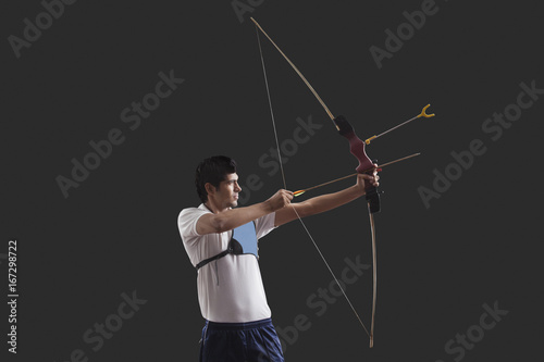 © IndiaPix, Obraz premium Male archer aiming against black background