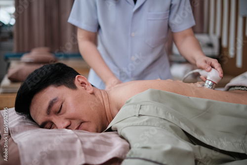 Obraz premium Male Asian patient recovery treated by gel ultrasound device for back pain...