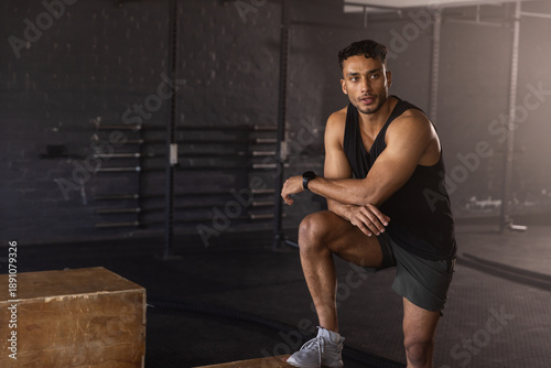 © wavebreak3, Fototapeta premium Male athlete pausing training kneeling on box beside battle rope wearing tracker in gym, copy space