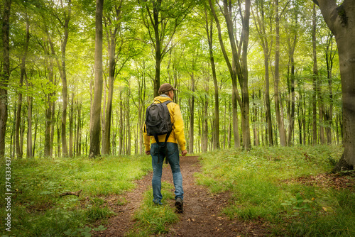 Obraz premium Male backpacker walking through a wooded forest,