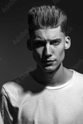 © Max, Naklejka premium Male beauty concept. Portrait of a fashionable young man with stylish haircut. Close up. Copy-space black and white image