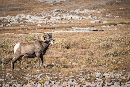 © Peter Kolejak, Naklejka premium Male bighorn sheep overlooking his territory during rutting season, Jasper N.Park, Canada