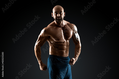 © Aliaksandr Marko, Naklejka premium Male bodybuilder with light stubble and bare torso shows muscularity against a dark background. The concept of a fitness club, doing sports, weightlifting. Copy space.