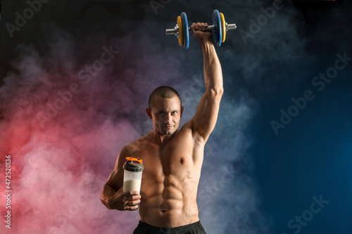 Obraz premium Male bodybuilder with protein shake and dumbbell on dark background