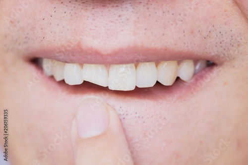 Naklejka premium Male broken teeth damaged cracked front tooth need dentist to fix and repair.