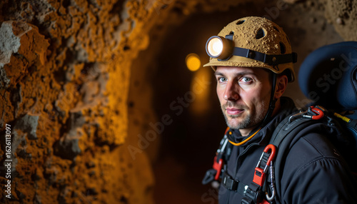 © Светлана Кудашкина, Fototapeta premium Male caver wearing helmet and headlamp in underground tunnel