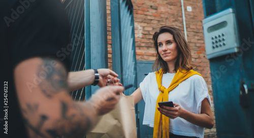 © SFIO CRACHO, Obraz premium Male courier with bicycle delivered no name shopping bag to the client.Courier delivery food service at home