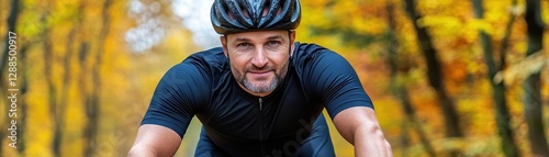 © taweesak, Fototapeta premium Male cyclist riding a bike in the autumn forest in warm weather Active lifestyle