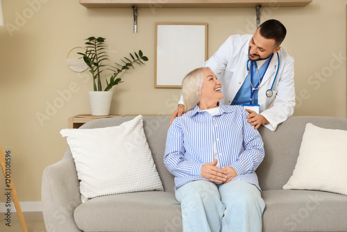 Fototapeta premium Male doctor hugging mature woman on sofa at home