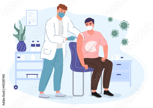 © Stekloduv, Obraz premium Male doctor in a mask and gloves makes an injection of a vaccine to a patient. Vaccination concept vector illustration.