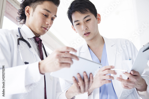 © Monet, Obraz premium Male doctors are talking while watching electronic tablet