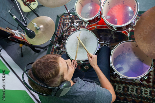 Fototapeta premium Male Drummer Performing In Recording Studio