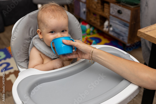 © Clear Emotion, Fototapeta premium małe dziecko siedzące w szarym krzesełku do karmienia. Dorosła osoba podaje mu niebieski kubeczek, z którego dziecko pije. Dziecko ma jasne włosy i niebieskie oczy.