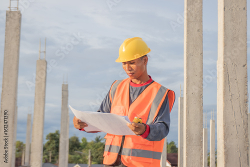 © NANKHAMMAI, Fototapeta premium Male engineer in hard hat and safety vest examines blueprint indoors at construction site; planning infrastructure project with expertise, teamwork, and efficiency.