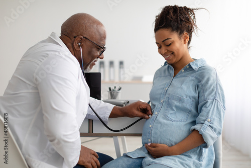 © Prostock-studio, Fototapeta premium Male experienced doctor examining young pregnant woman