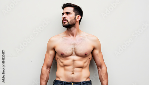 © Yosich1961, Fototapeta premium Male figure standing against wall with clenched jaw and distant gaze