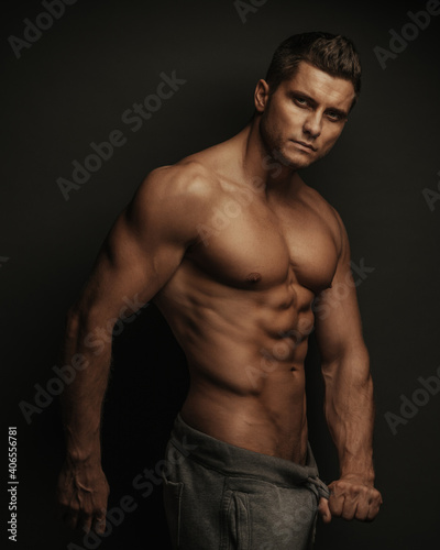 © Serge Lee, Fototapeta premium Male fitness model standing on black background with holding his pant's ropes