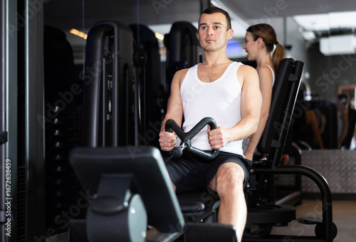 Fototapeta premium Male gym visitor exercises on simulator in order to strengthen muscles of...