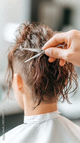 © Antto-AI, Naklejka premium Male hairdresser cutting curly hair with scissors, focused on detail
