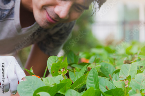 © nationkp, Obraz premium male hand hold scissors pruching branch of Ixora flower