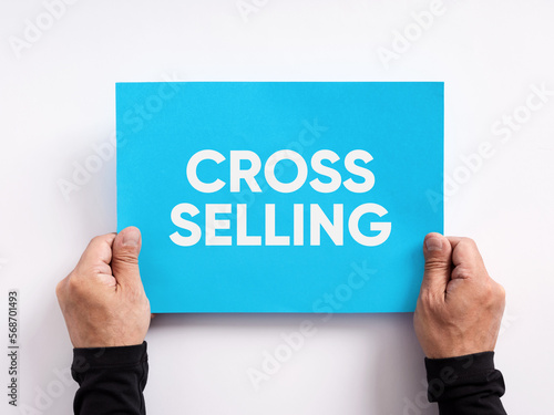 © Cagkan, Fototapeta premium Male hand holding a blue paper with the word cross selling. Selling different products or services to an existing customer.