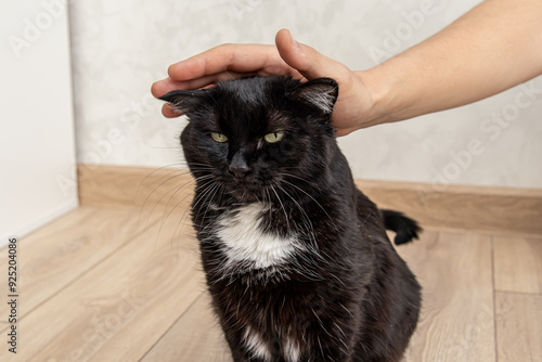 © Svetlana, Naklejka premium Male hand petting black cat. Disgruntled cat
