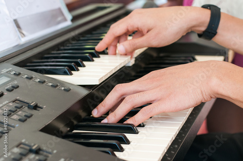 © yotrakbutda, Fototapeta premium Male hands playing the piano