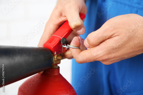Naklejka premium Male hands pulling safety pin of fire extinguisher closeup