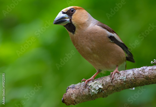 © NickVorobey.com, Fototapeta premium Male hawfinch perched on a dry lichen covered branch in forest