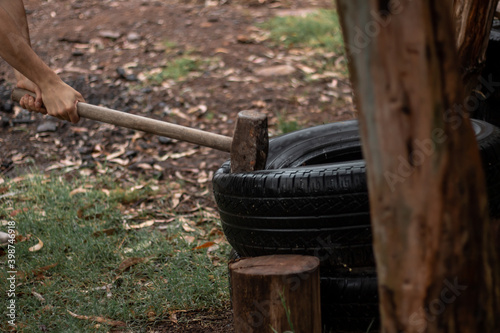 Fototapeta premium male hiting tires with sledgehammer closeup