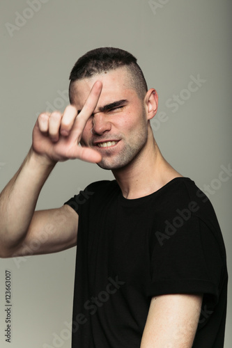 © kkolosov, Fototapeta premium Male in black t-shirt on grey studio background making L gesture with his hand