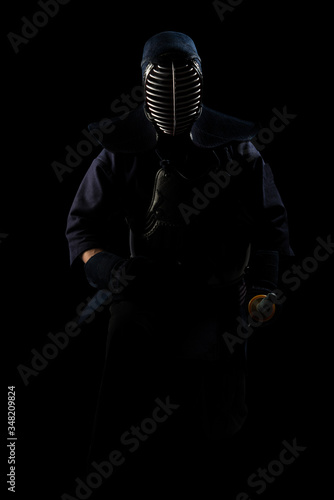 © maximapryatin, Naklejka premium male in tradition kendo armor with shinai (bamboo sword). shot in studio. Isolated with clipping path on black background