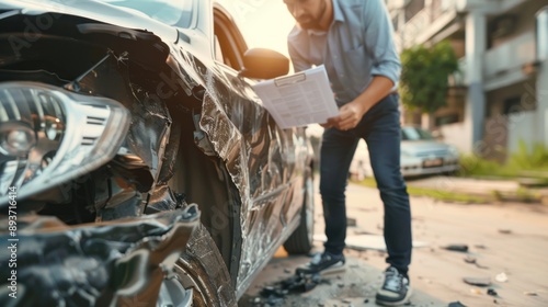 © putri syakilla, Obraz premium male insurance agent inspects damaged car after accident