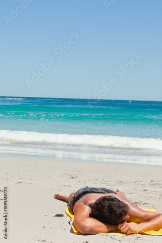 Fototapeta premium Male is lying face down on yellow beach towel on pale sand with gentle waves breaking