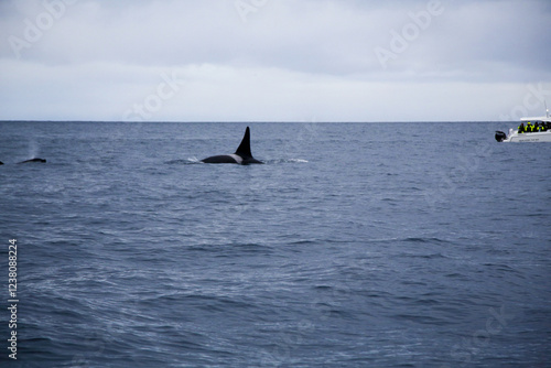 Naklejka premium Male killer whale swimming in the Norwegian Sea near Skjervoya island....