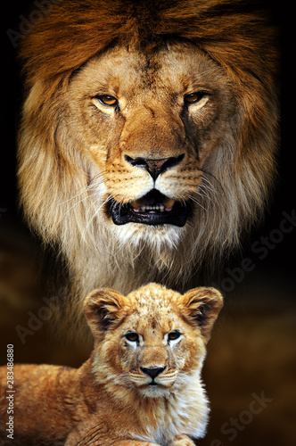 © byrdyak, Fototapeta premium Male lion and cub portrait on savanna landscape background