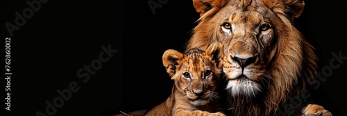 Fototapeta premium Male lion and cub portrait with empty space on the left for text, object on...