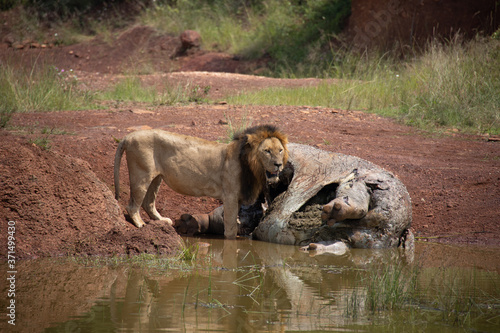 Fototapeta premium Male Lion Eating Dead Hippo in Kenya, Africa