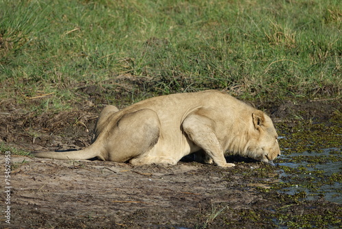 Obraz premium Male lion in the Okavango Delta after feeding on a Buffalo Kill