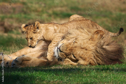 © Nick, Naklejka premium Male Lion playing with cub