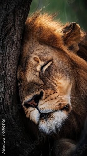 © Shozib, Fototapeta premium Male lion resting its head against a tree in the shade