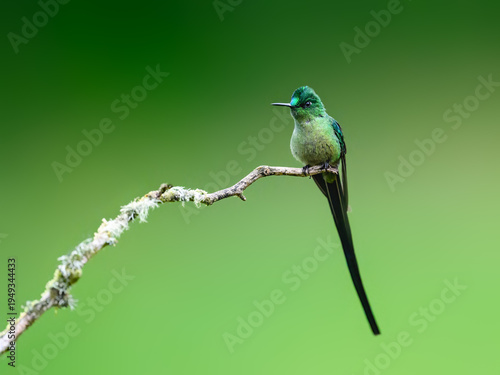 © FotoRequest, Naklejka premium Male Long-tailed Sylph Hummingbird Perched on Lichen Covered Branch