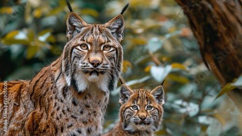 © Ilja, Fototapeta premium Male lynx and cub portrait with text space on left, balanced by object on right side
