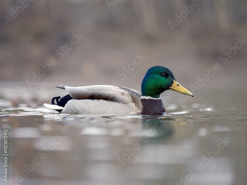 © vadim, Obraz premium Male mallard duck swimming in river, close-up