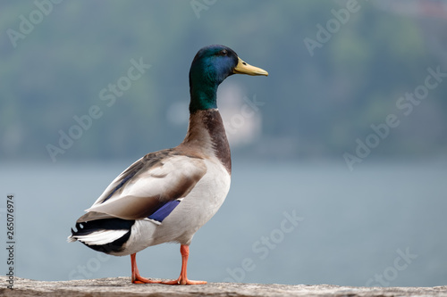 Fototapeta premium Male Mallard standing on a wall