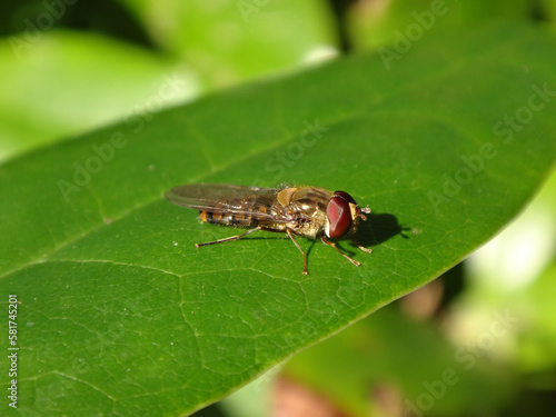 Fototapeta premium Male marmalade hover fly (Episyrphus balteatus) sitting on a green leaf