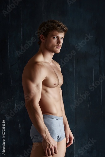© Pojjanee, Fototapeta premium Male Model in Gray Boxer Briefs Against Dark Background