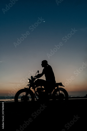 Obraz premium Male model on a custom bike during sunset in the beach